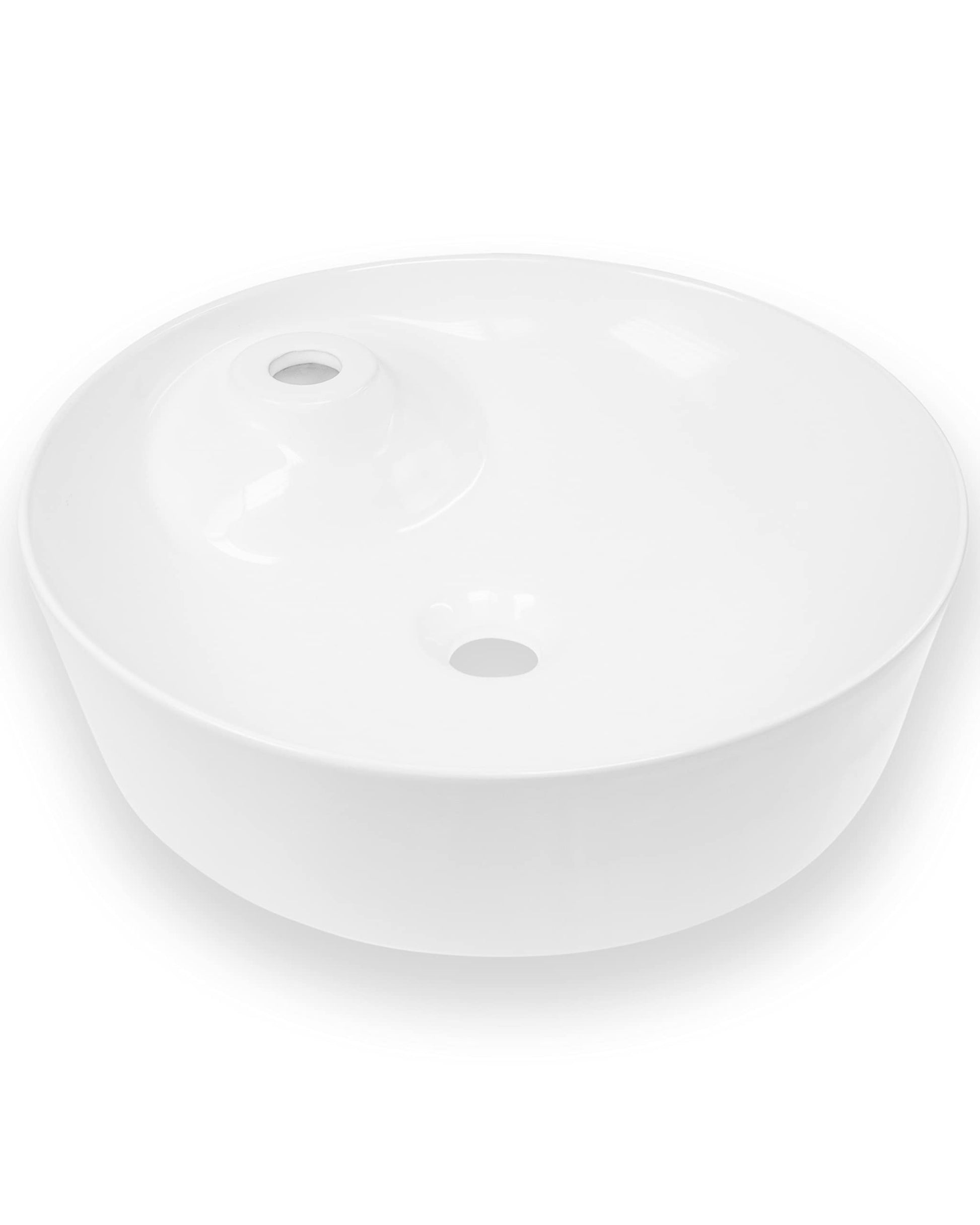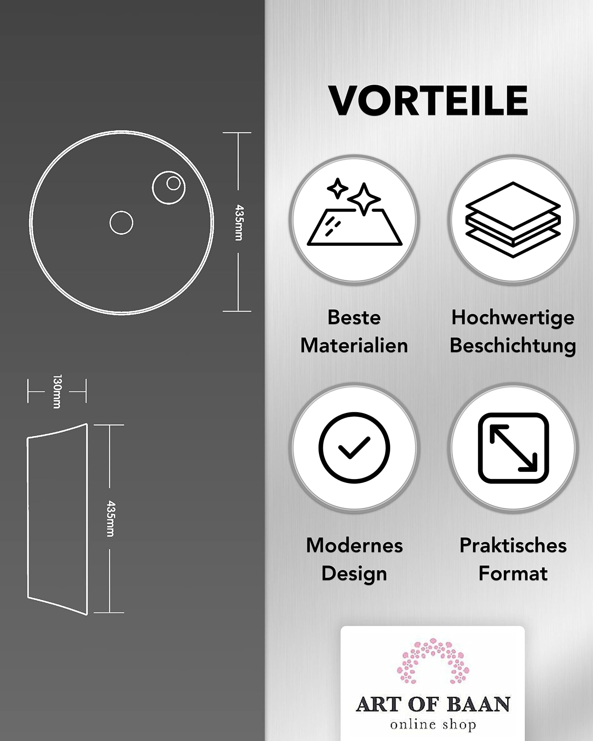 Keramik Waschbecken in innovativem Design von Art-of-Baan - Für Ihr modernes und elegantes Badezimmer. Unser rundes Eckwaschbecken kann mit vielen positiven Eigenschaften begeistern. Die Qualität der WC-Waschbecken liegt uns sehr am Herzen. Deshalb achten wir besonders auf hochwertige Materialien und eine sichere Herstellung. Die Glasur in Hochglanz der Aufsatzwaschbecken ist weiß und glatt, robust und kratzfest. Außerdem ist die runde Keramik-Waschschüssel lichtbeständig und behält dauerhaft ihre Farbe. Darüber hinaus überzeugt das Waschbecken mit Lotuseffekt und damit mit einfacher Reinigung. Die innovative Nanobeschichtung sorgt dafür, dass das runde Waschbecken weniger anfällig für Ablagerungen und anderen Schmutz ist. Somit sorgt unser Gästewaschbecken für langanhaltende Freude im Badezimmer. Generell haben Keramikwaschtische eine geringe Wasseraufnahme und weisen eine gute Korrosionsbeständigkeit gegen Säuren, Laugen und Salze auf. Der Waschtisch hat ein schlichtes, aber einzigartiges Design. Der runde Stil und die glatten Linien spiegeln die feine Eleganz wieder. Das moderne Erscheinungsbild fügt sich nahtlos in Ihr Badezimmer ein und ist mit verschiedenen Stilen und Dekors kombinierbar. Mit den Abmessungen von 435 x 435 x 130 mm ist das Aufsatzwaschbecken optimal für jedes Bad geeignet, das nach einer stilvollen, aber platzsparenden Lösung verlangt. Das Badezimmer-Waschbecken kann dank DIN-Hahnloch und DIN-Standard-Abfluss einfach montiert werden. Durch die Standardmaße sind sie in der Montage flexibel und können jede beliebige Ablaufart mit dem Waschbecken für Gäste WC und Bad kombinieren. Zudem können Sie die Waschbecken Schale auf jeder Oberfläche anbringen und Ihrer Badgestaltung freien Lauf lassen. Soll es frei stehen oder doch auf einem Unterschrank stehen? Kein Problem - Die Entscheidung liegt bei Ihnen. Hinweis: Ablaufgarnitur und Armatur nicht im Lieferumfang enthalten.