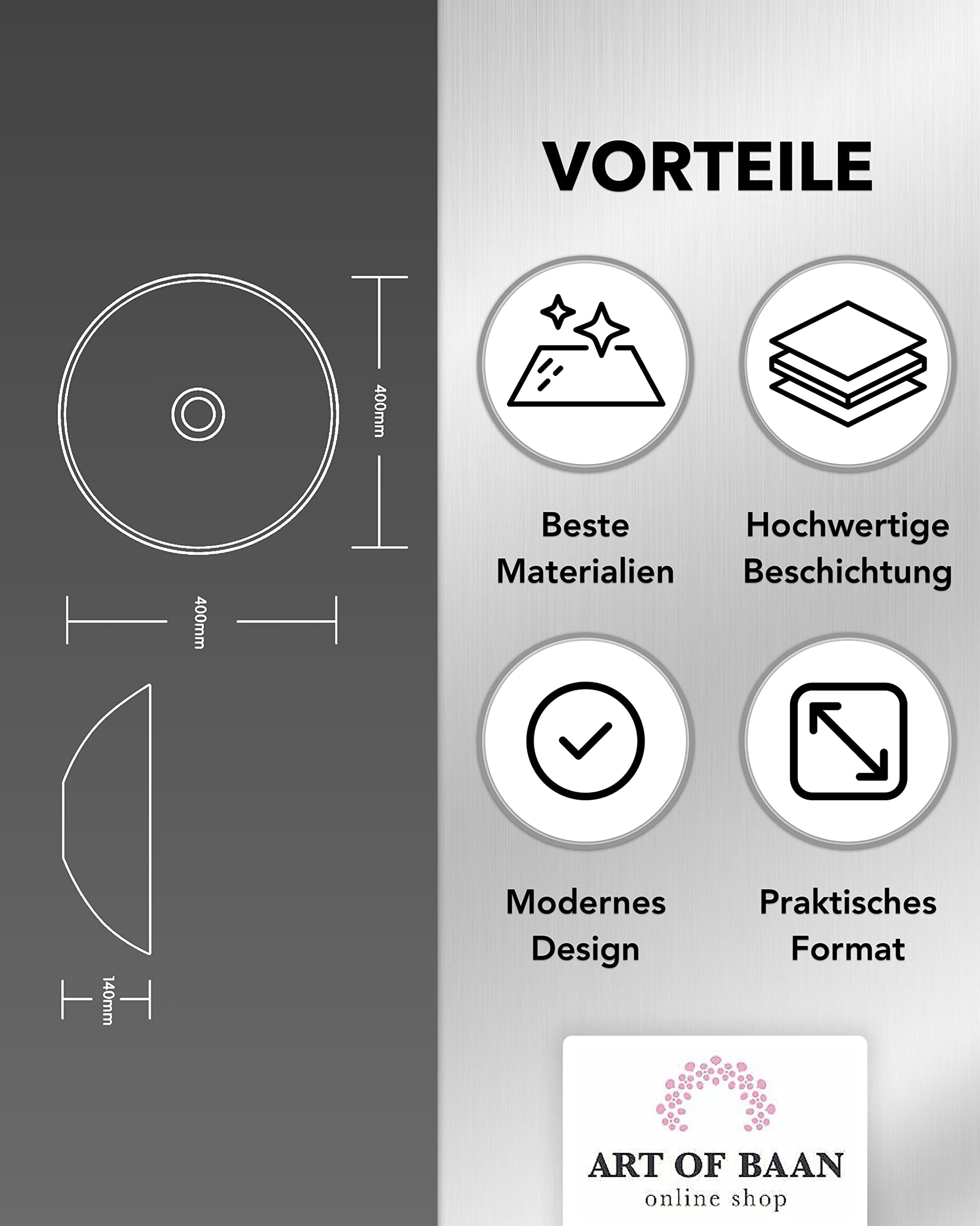 Der runde Stil und die glatten Linien spiegeln die feine Eleganz wieder. Das moderne Erscheinungsbild fügt sich nahtlos in Ihr Badezimmer ein und ist mit verschiedenen Stilen und Dekors kombinierbar. Mit den Abmessungen von 400 x 400 x 140 mm ist das Aufsatzwaschbecken optimal für jedes Bad geeignet, das nach einer stilvollen, aber platzsparenden Lösung verlangt. Das Badezimmer-Waschbecken kann dank DIN-Hahnloch und DIN-Standard-Abfluss einfach montiert werden. Durch die Standardmaße sind sie in der Montage flexibel und können jede beliebige Ablaufart mit dem Waschbecken für Gäste WC und Bad kombinieren.